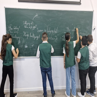Apoi s-a supus la vot și s-a ales ca tema proiectului să fie cea legată de bullying.Elevii au fost rugați să se gândească la titlu temei ,iar pe rând ,fiecare elev a mers la tablă și a scris titlul propus. S-a supus la vot și s-a ales titlul „Bullying-ul trebuie oprit”.